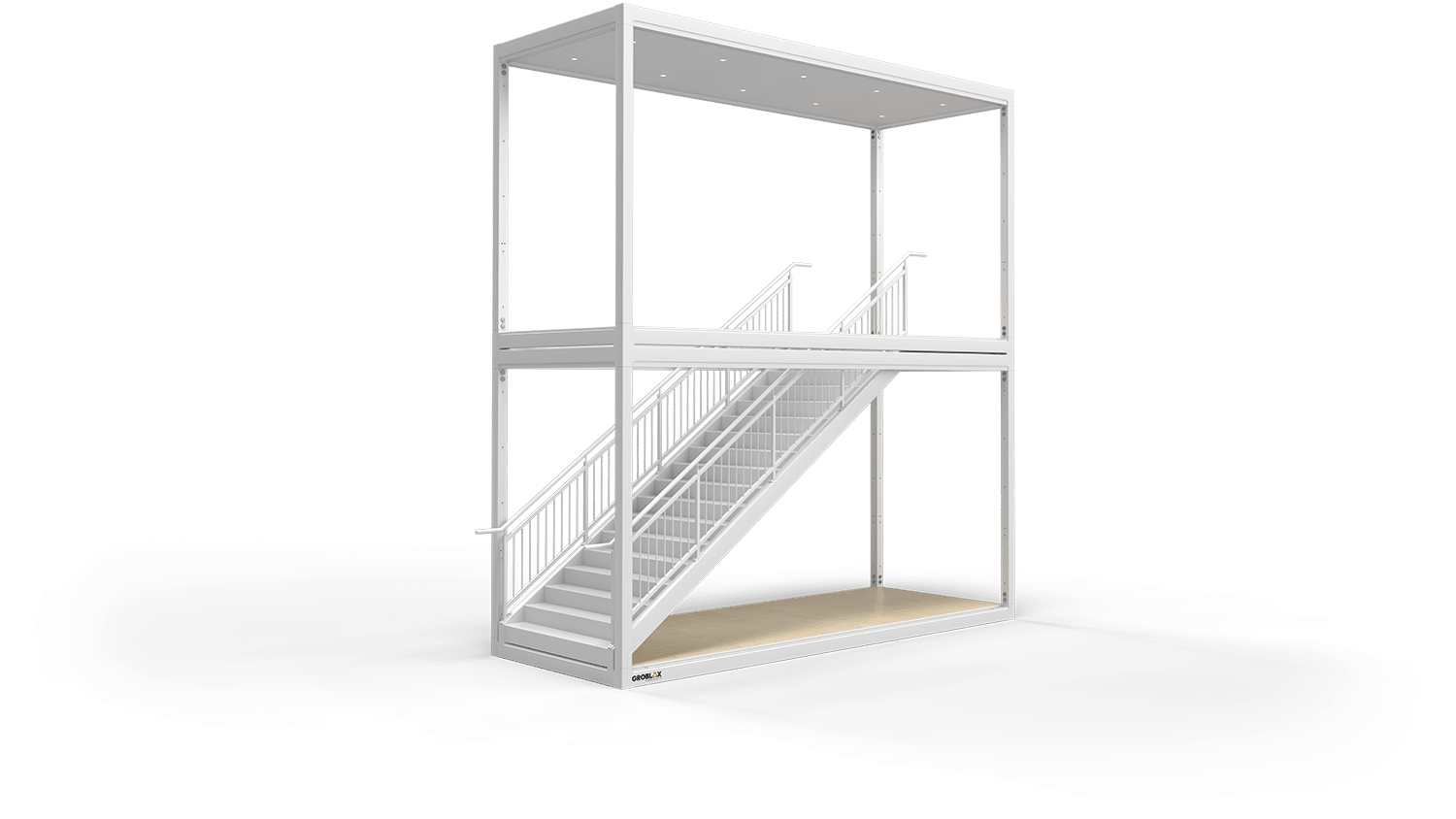 The GRST6020 Double Stair Unit is a 2.0m-wide staircase designed for high-traffic spaces. With open 6.0m ceilings, it provides a grand, inviting entrance to the second level, adding openness and scale to your multi-level structures. Perfect for large-scale pop-ups, brand activations, and events, this essential block seamlessly connects floors to enhance flow and functionality.